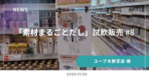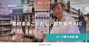 本日、堺市のコープ大野芝店(堺市中区大野芝町23-1) にて、「素材まるごとだし」の試飲販売を行っています。 店頭では、思わず足を止めてくださる方も多く、「やさしい味で飲みやすい」「スープ代わりにも良さそう」といった温か […]