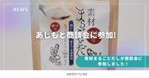 本日、東京銀座で開催されている「あしもと商談会」に、私たちの商品である 「素材まるごとだし」 の試飲ブースを設けて参加しています。 あしもと逸品プロジェクトが掲げる“入口(つくり手)と出口(売り手)が顔の見える関係でつな […]